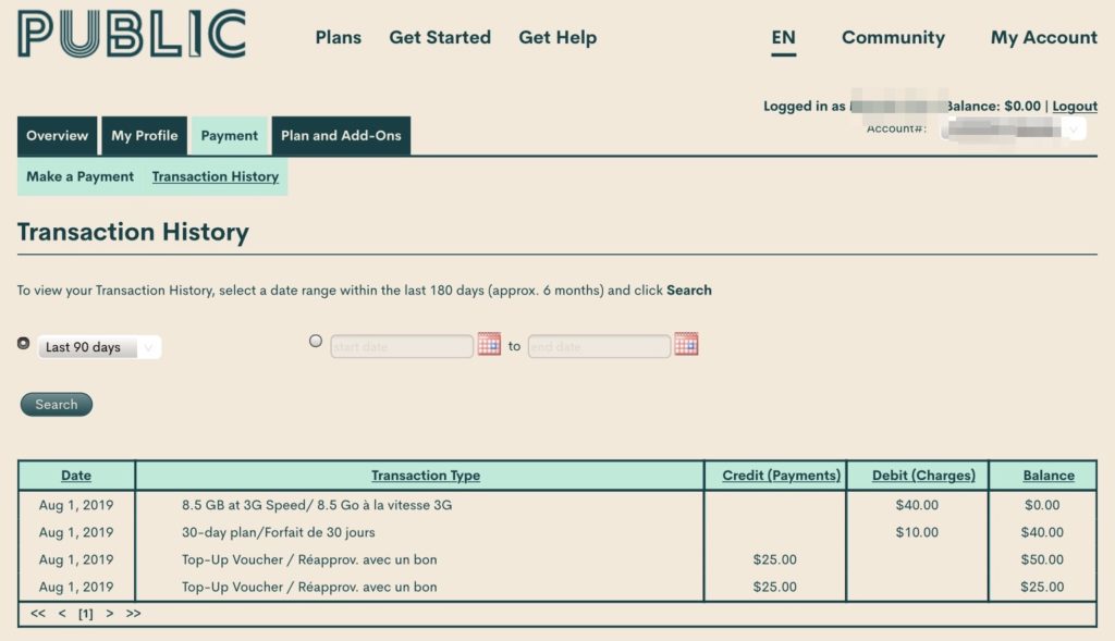 使用する予定金額のバウチャーをカナダで購入しておけば、あとは『カナダで発行されたクレジットカードでの支払い』以外でも(しかも世界中どこからでも)Public MobileのWebsiteからTop-upできるということ。