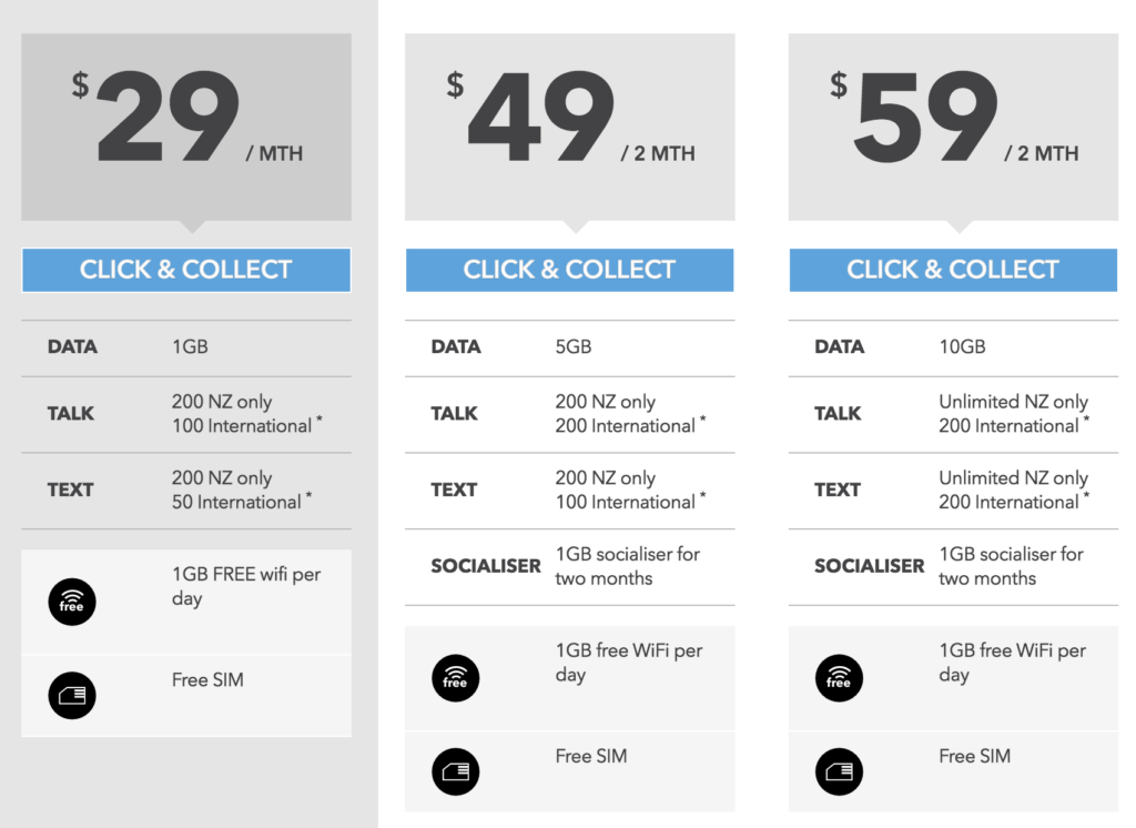 まぁいつもの如く滞在日数を聞かれたので10日と答えたら今なら1GB+1GBで合計2GB使えるとのことだったので、29 NZDのものが欲しい旨伝えました(下記はオンラインで入手する場合の画面・・・この場合は2GBにはならないみたいに見えます)。